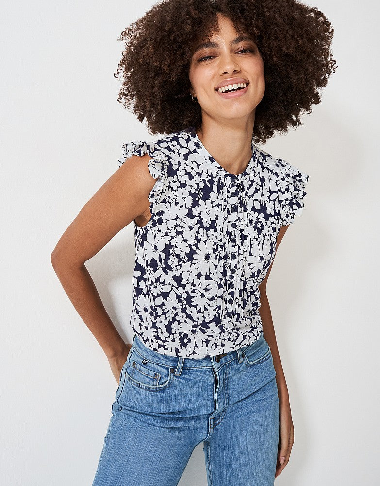 Our Lydia blouse in a navy floral print. A soft jersey top, the Lydia blouse is crafted from a cotton and linen blend for a breathable, comfortable feel, complete with temperature regulating properties. An extra stylish top made with pleats down the placket and ruffled sleeves. It’s just the thing to pair with light denim and trainers.