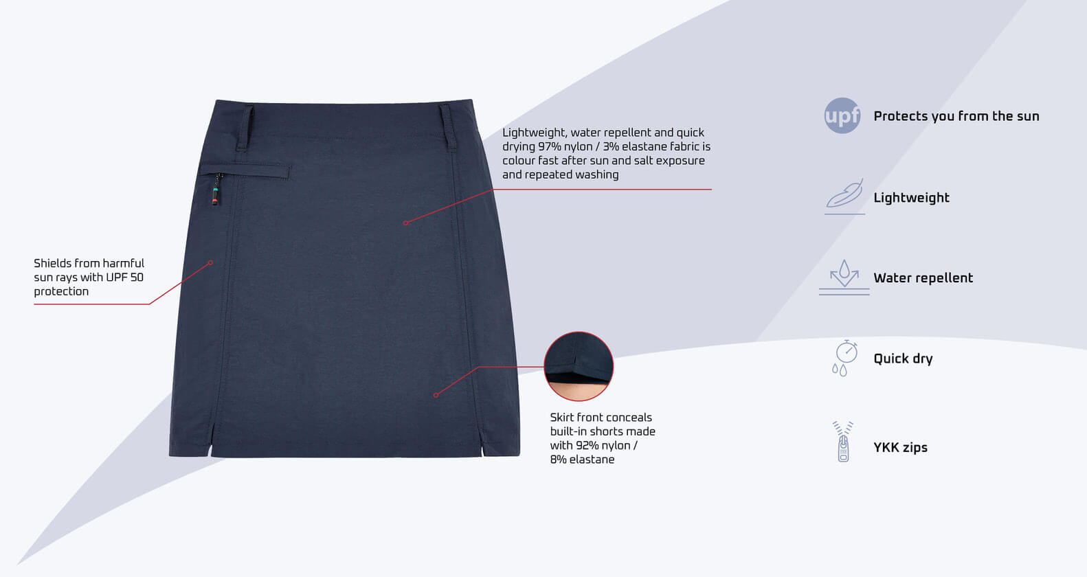Comfortable, classic and resolutely practical on board, our Corsica crew skort is a brand-new style designed for boating, après-sail and active use ashore. The super-soft, lightweight fabric repels water and dries off quickly when it does get splashed. Built to last, it remains colour fast even after long exposure to salt and sun, and stands up to repeated washing. It's also a highly effective sun block with UPF-50 UV protection. The built-in shorts have plenty of stretch, giving you total freedom of movement and there's a handy pocket on the hip, secured with a zip.