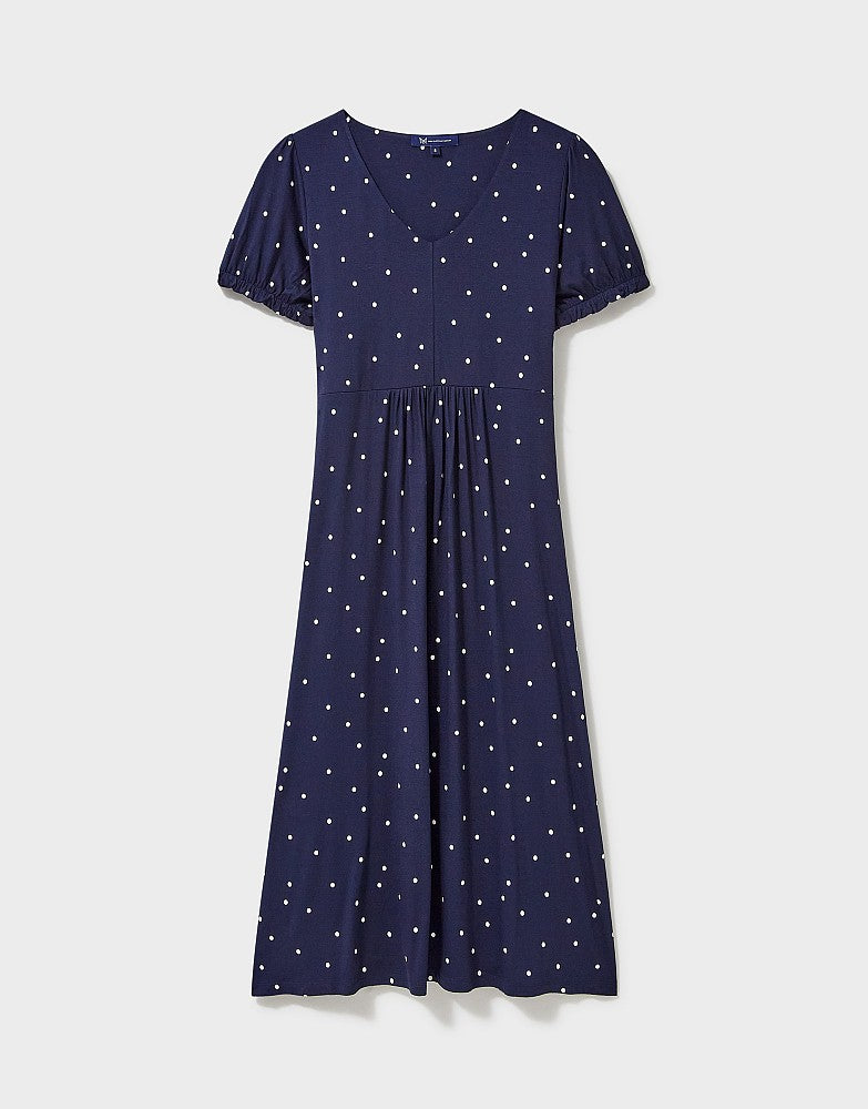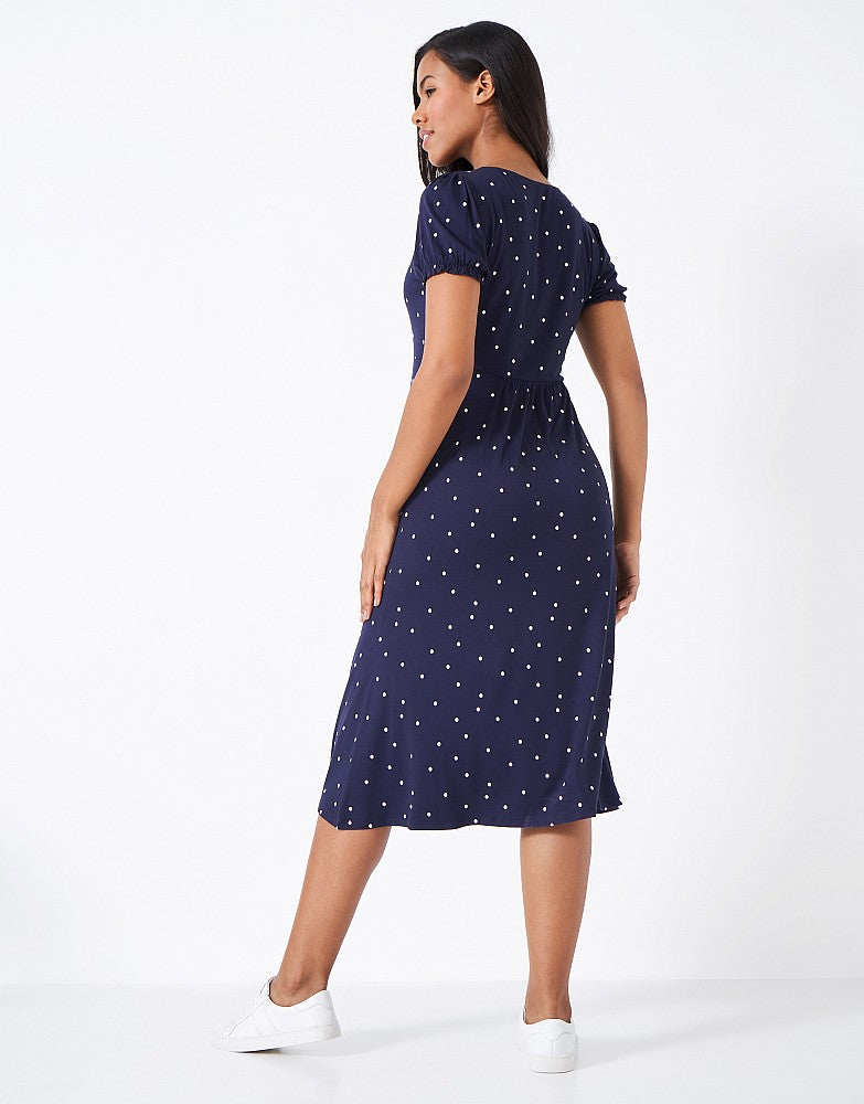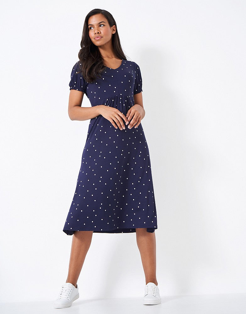 A jersey dress in an eye-catching navy and white polka dot print. It's cut with a touch of stretch for wear-all-day comfort, plus the elasticated sleeves add a feminine touch. Wear with trainers for easy, everyday style.